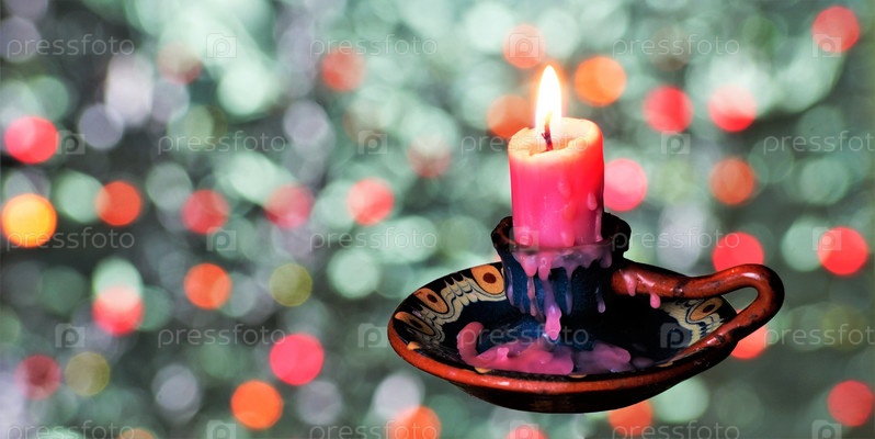 Яркая свеча в винтажном подсвечнике освещает свободное пространство разноцветного фона боке для творческого дизайна и написания метафорического текста