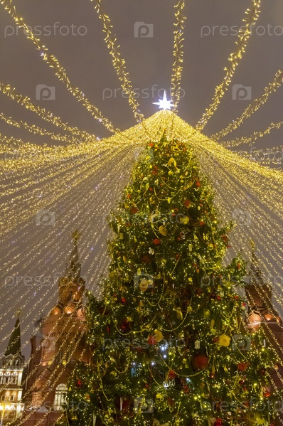 Большая новогодняя елка на открытом воздухе. Москва, Площадь Революции. Традиционный новогодний фестиваль "Путешествие в Рождество"