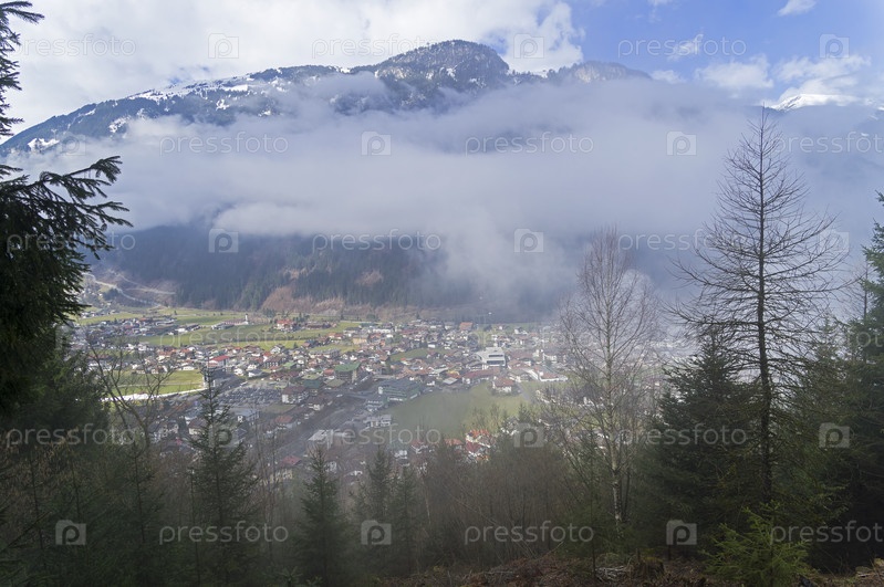 Вид с горного склона на горнолыжный курорт Майрхофен. Тироль, Австрийские Альпы