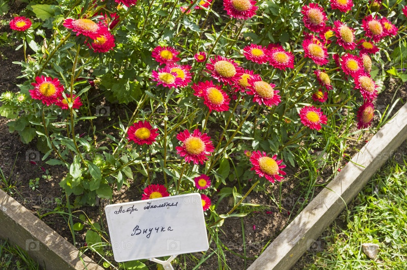 Цветущие красно-желтые астры с табличкой с названием сорта ("Внучка") в Аптекарском Огороде (филиал ботанического сада МГУ). Москва. Солнечный день в сентябре