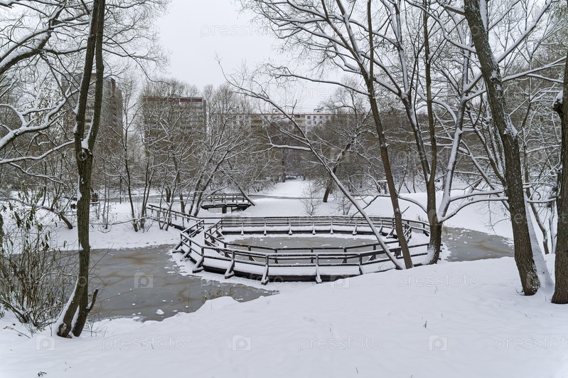 Недавно замерзший городской пруд. Троицкий пруд, Коньково, Москва, Россия. Предзимье. Конец ноября