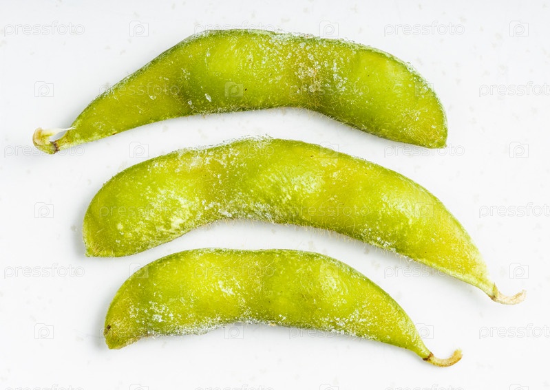 Несколько замороженных стручков эдамаме крупным планом на сером