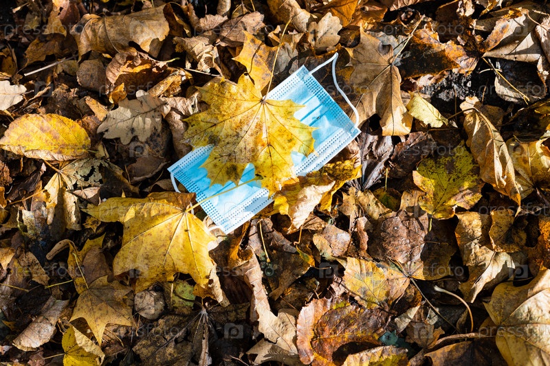 Сброшенная маска для лица, покрытая опавшими кленовыми листьями