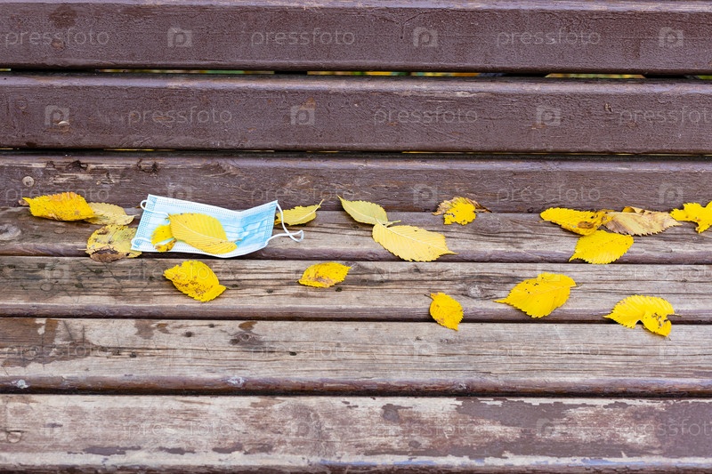 Сброшенная маска и листья на ветхой скамейке