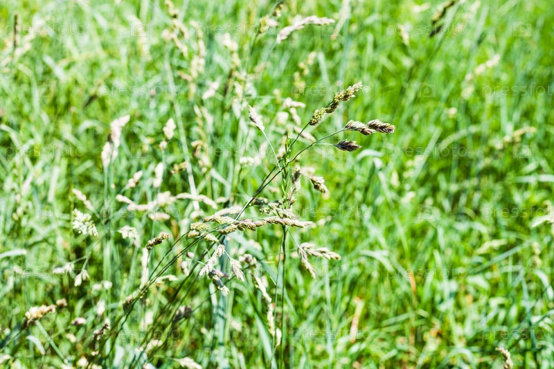 Колоски в зеленой траве крупным планом на зеленой лужайке