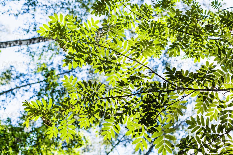 Зеленая ветвь рябины, освещенная солнцем