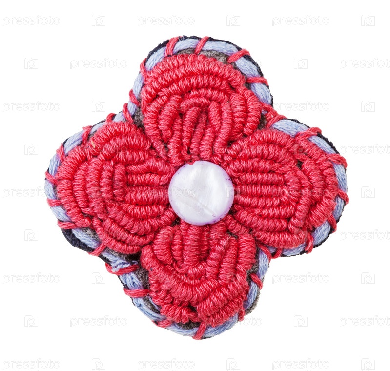 Брошь-цветок, вышитая красными шелковыми нитками