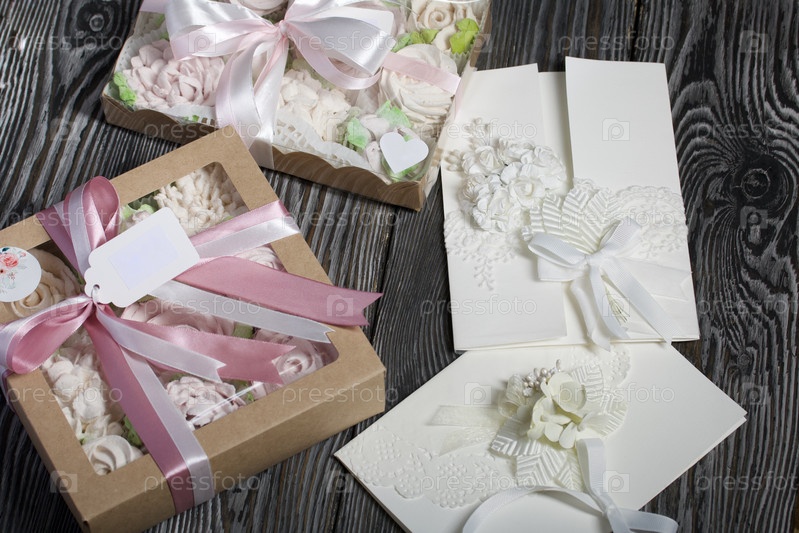 Домашний зефир в подарочной упаковке. Перевязан лентой. Зефир цветы. Домашняя открытка в белом цвете. С декоративными элементами. На картон крепятся ленты, цветы и листья. На черных сосновых досках