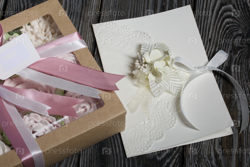 Домашний зефир в подарочной упаковке. Перевязан лентой. Зефир цветы. Домашняя открытка в белом цвете. С декоративными элементами. На картон крепятся ленты, цветы и листья. На черных сосновых досках