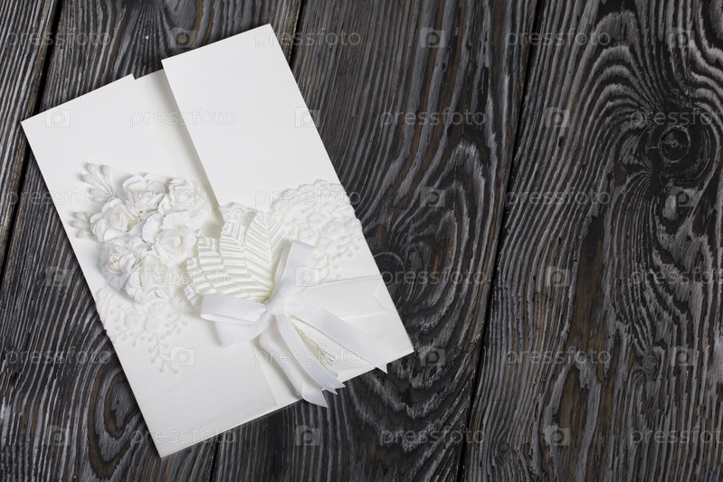 Домашняя открытка в белом цвете. С декоративными элементами. На картон крепятся ленты, цветы и листья. Крупный план