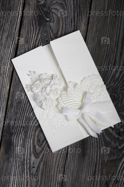 Домашняя открытка в белом цвете. С декоративными элементами. На картон крепятся ленты, цветы и листья. Крупный план