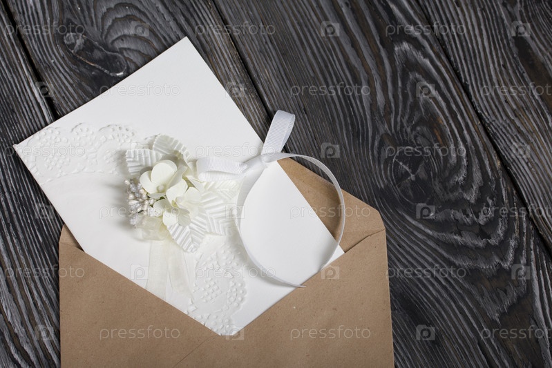 Домашняя открытка в белом цвете. С декоративными элементами. На картон крепятся ленты, цветы и листья. Бумажный конверт. Крупный план