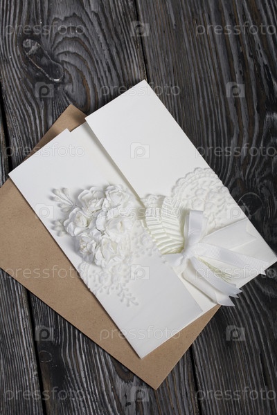 Домашняя открытка в белом цвете. С декоративными элементами. На картон крепятся ленты, цветы и листья. Бумажный конверт. Крупный план