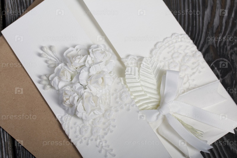 Домашняя открытка в белом цвете. С декоративными элементами. На картон крепятся ленты, цветы и листья. Бумажный конверт. Крупный план