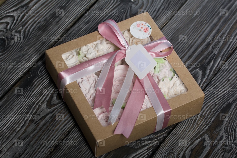 Домашний зефир в подарочной упаковке. Перевязан лентой. Зефир цветы. На черных сосновых досках. Взято сверху