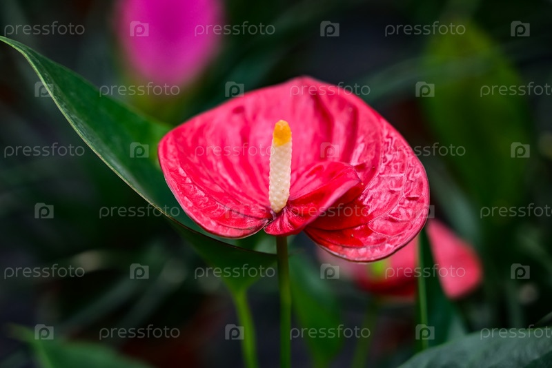 Цветок Антуриум Андре красный с сердцевидными листьями. крупным планом