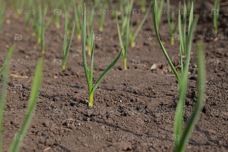 Чеснок выращивают на грядке. Свежие зеленые овощные листья на ферме. Выращивайте для здорового питания. Урожай для вегетарианских блюд