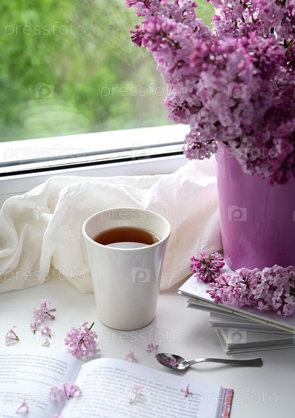 Открытка красивая. Кружка чая, старая книга и букет фиолетовой сирени. Красивый натюрморт. Весеннее время. Концепция доброго утра