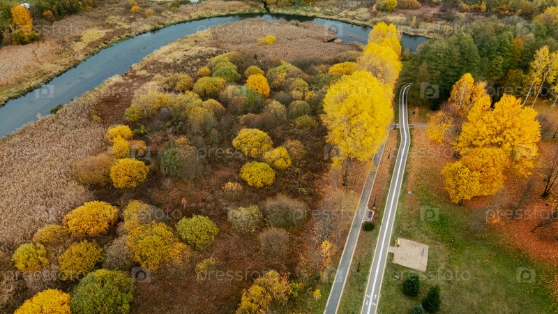 Осенний городской парк. Деревья с разноцветными листьями. Между деревьями вьется велосипедная дорожка. Осенний пейзаж. Аэрофотосъемка