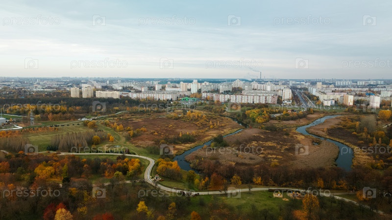 Осенний городской парк. Деревья с разноцветными листьями. Между деревьями вьется велосипедная дорожка. Осенний пейзаж. Аэрофотосъемка