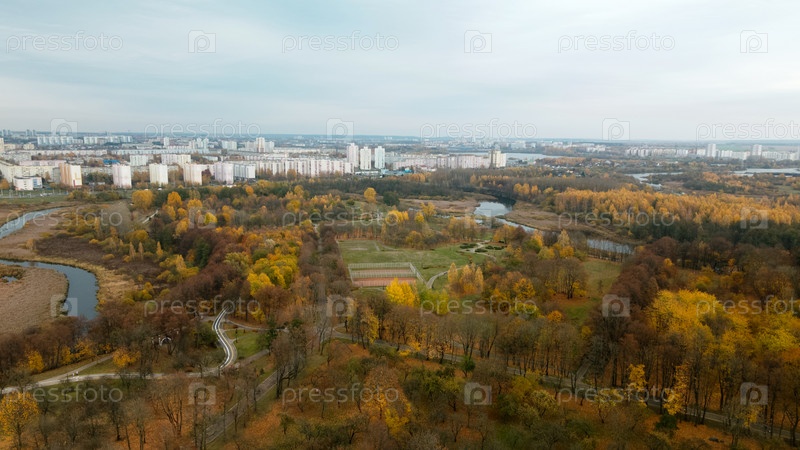 Осенний городской парк. Деревья с разноцветными листьями. Спортивные площадки. Осенний пейзаж. Аэрофотосъемка. Полет с медленной камерой вниз