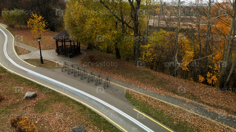 Осенний городской парк. Деревья с разноцветными листьями. Между деревьями вьется велосипедная дорожка. Осенний пейзаж. Аэрофотосъемка