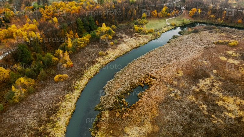 Осенний городской парк. Между деревьями течет извилистая река. Деревья с разноцветными листьями. Осенний пейзаж. Аэрофотосъемка