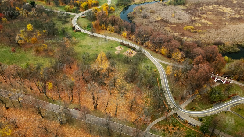 Осенний городской парк. Деревья с разноцветными листьями. Между деревьями вьется велосипедная дорожка. Осенний пейзаж. Аэрофотосъемка