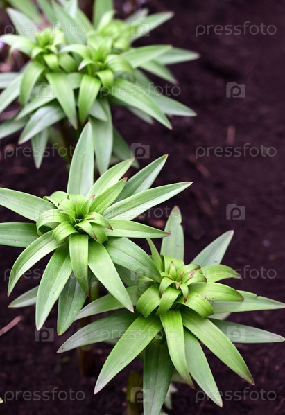 Фото зеленых листьев лилии, молодых побегов. Текстура зеленой травы