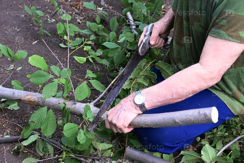 Мужчина пилой отпиливает деревянную доску. Концепция уборки на дачном участке