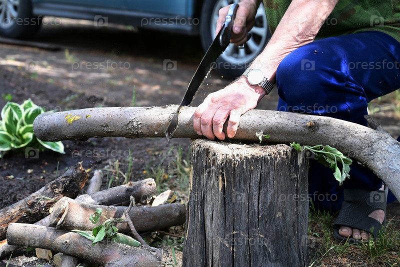 Мужчина пилой отпиливает деревянную доску. Концепция уборки на дачном участке