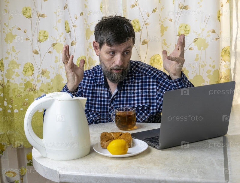 Мужчина в клетчатой рубашке за завтраком на кухне возмущается у монитора