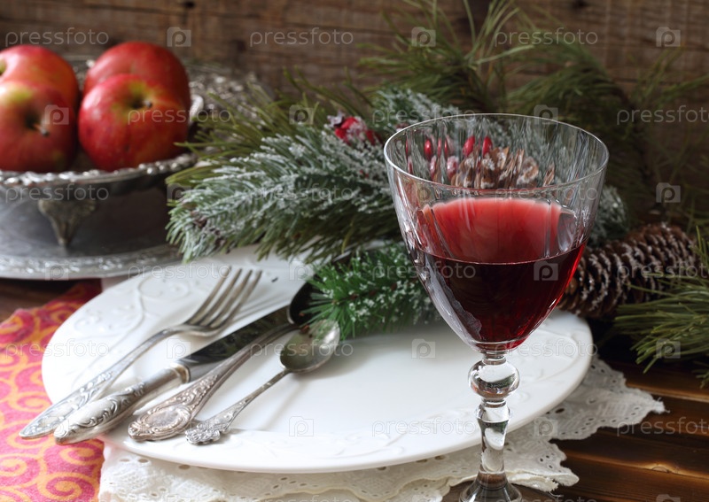 Натюрморт с гранатом и бокалом красного вина возле еловой ветки