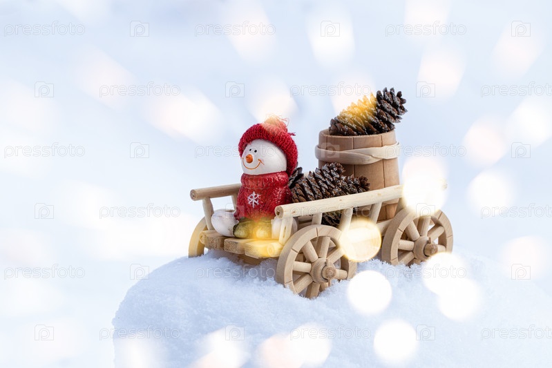Праздничный новогодний фон со снеговиком на деревянной тележке. Счастливый снеговик в зимнем рождественском пейзаже