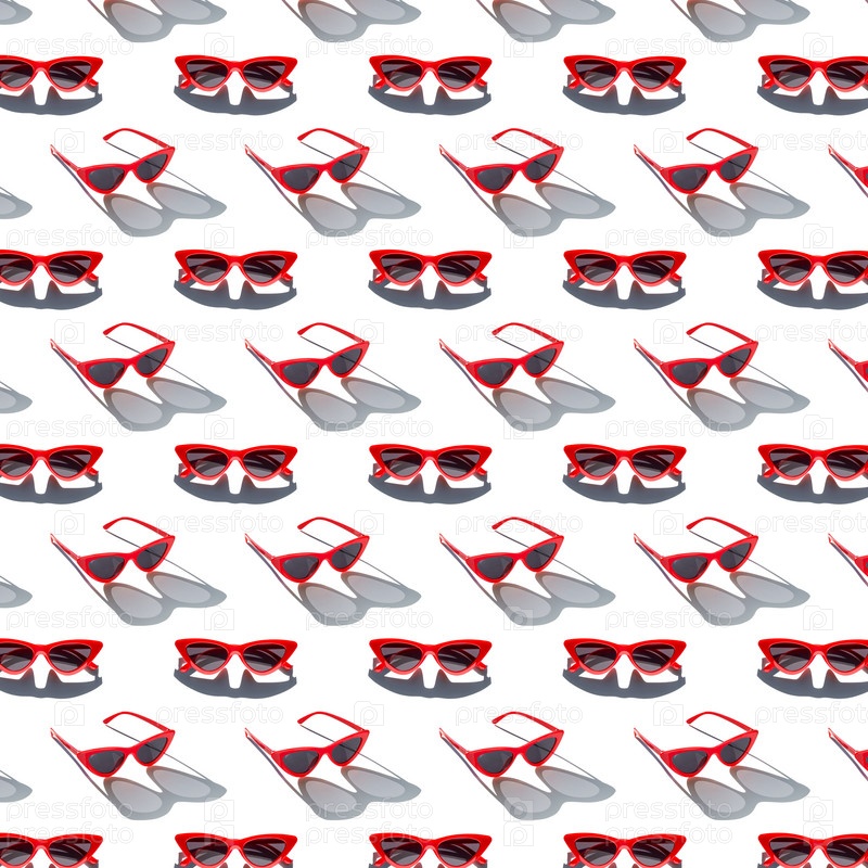 Красные солнцезащитные очки бесшовный узор на белом фоне. Концепция минималистского летнего отдыха и защиты от ультрафиолета. Солнечный фон с жестким светом и тенью