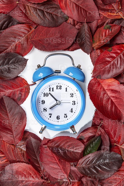 Рамка из осенних листьев с будильником на белом фоне