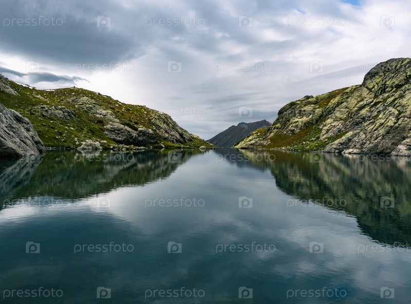 Зеркальное отражение спокойной воды озера и неба на фоне гор