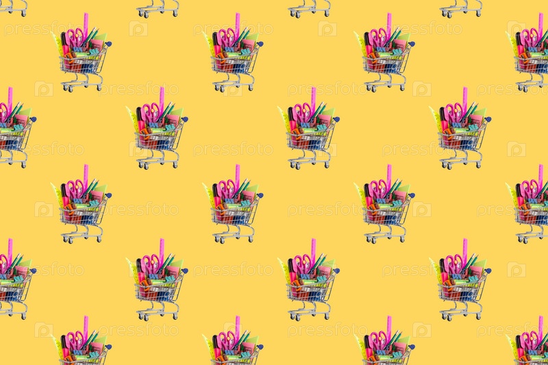 Бесшовный узор. Корзина с школьными канцелярскими принадлежностями на желтом фоне. Вернуться к школьной концепции. Композиция со школьными принадлежностями на цветном фоне. Бесшовный фон и текстура