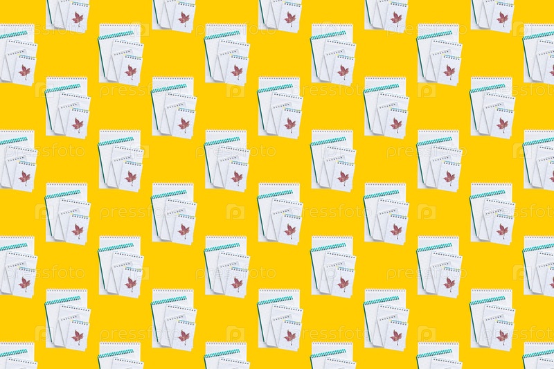 Бесшовный фон с блокнотами на желтом фоне. Вернуться к школьной концепции. Композиция со школьными принадлежностями на цветном фоне. Бесшовный фон и текстура