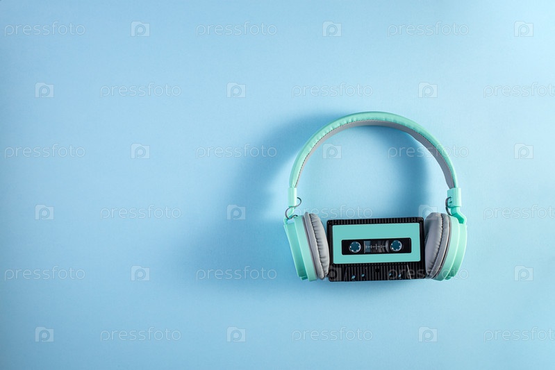 Бирюзовые наушники с аудиокассетой на синем фоне. Музыкальная концепция