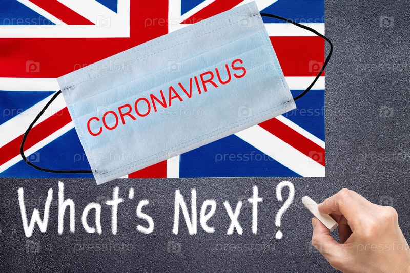Флаг Великобритании с одноразовой маской и надписью CORONAVIRUS