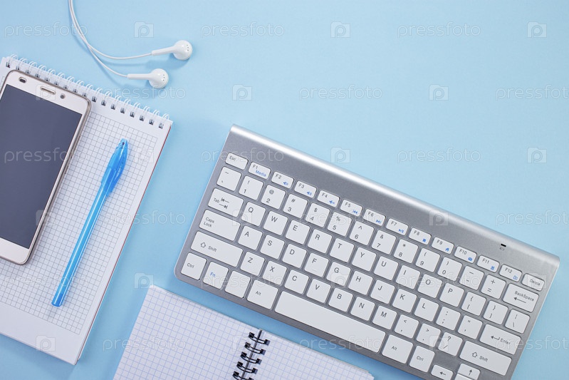 Офисный стол сверху с блокнотом, клавиатурой, бумажным блокнотом и расходными материалами на синем фоне
