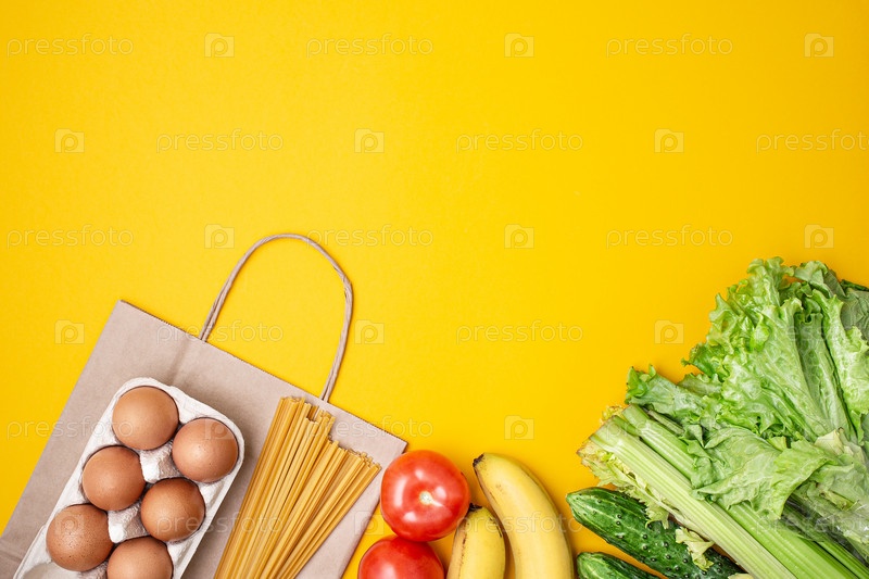 Бумажный пакет с едой, консервами, помидорами, огурцами и бананами на желтом фоне