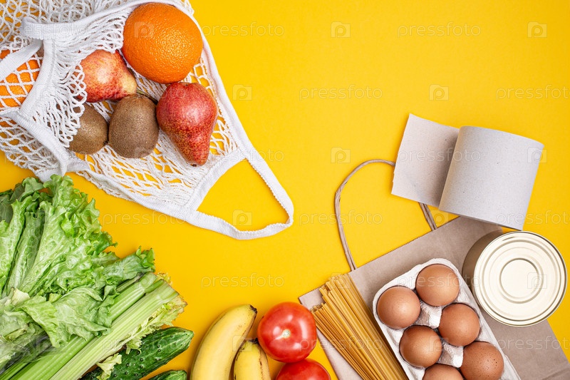 Бумажный пакет с едой, консервами, помидорами, огурцами, бананами на желтом фоне