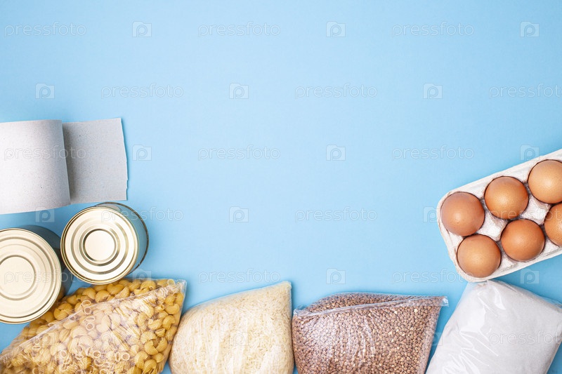 Доставка еды. Рис, гречка, макароны, консервы, сахар, туалетная бумага на синем фоне