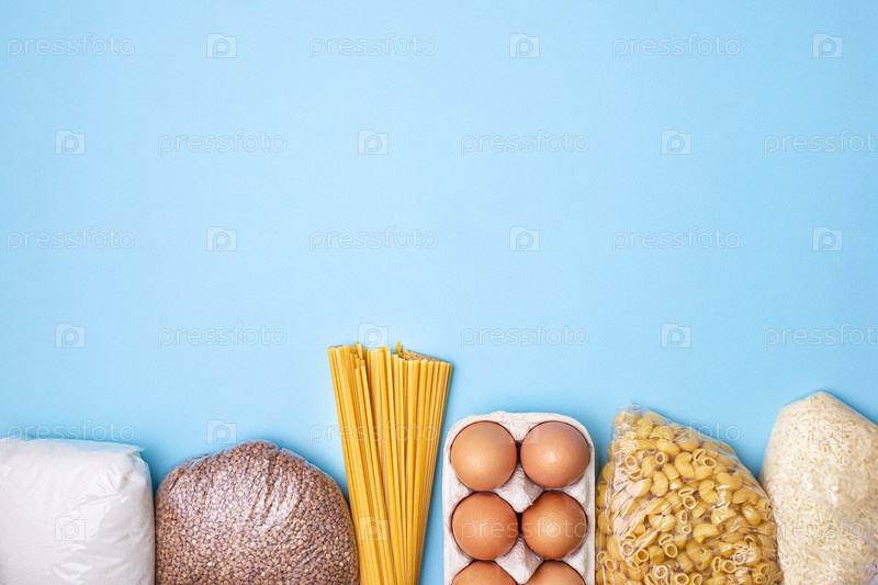 Доставка еды. Рис, гречка, макароны, консервы, сахар на синем фоне