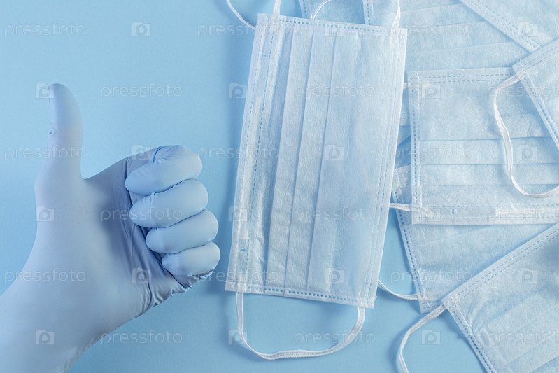 Рука в медицинской перчатке палец вверх защитная маска на синем фоне
