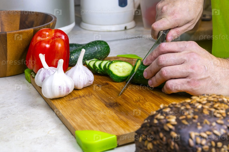 Мужские руки нарезают овощи для салата небольшими кусочками