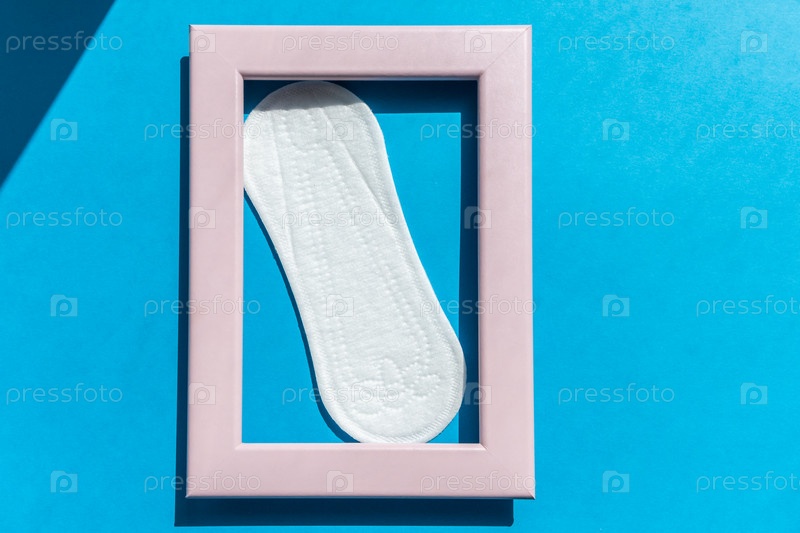 Белая гигиеническая прокладка в розовой фоторамке на синем фоне