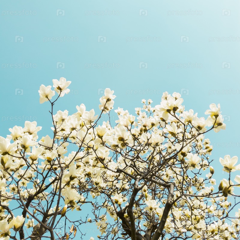 Красивые цветы белой магнолии кобус на фоне голубого неба